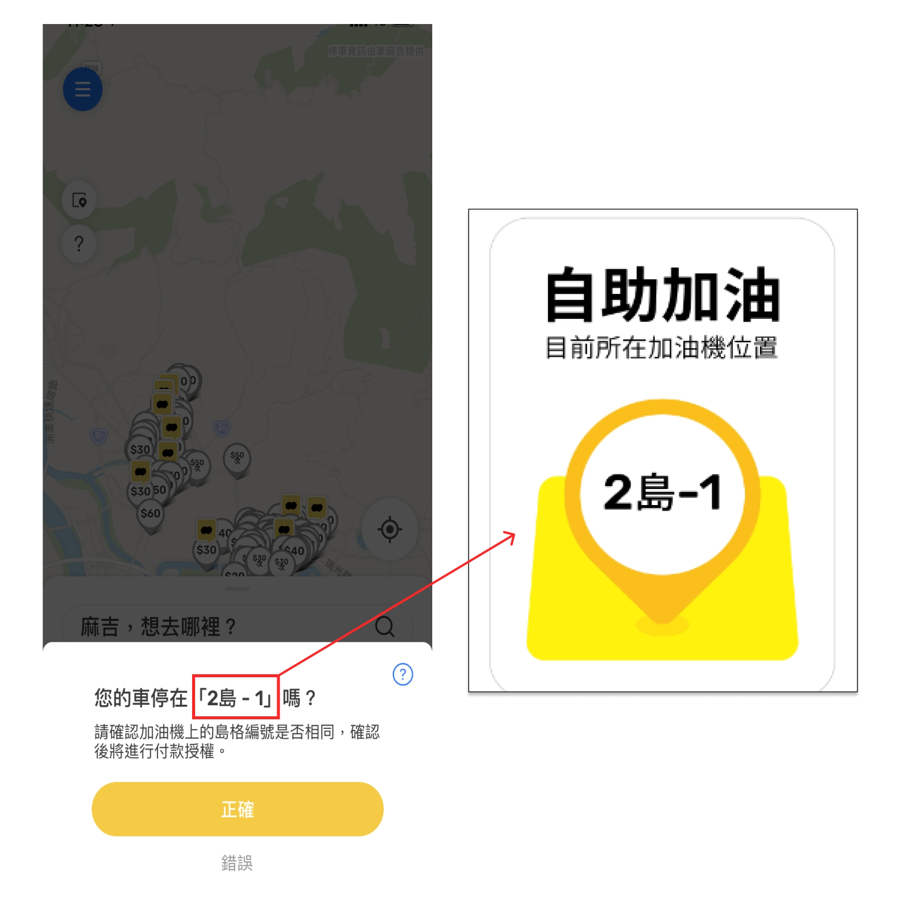 請您確認所在的島格位置,手機畫面顯示需與加油機上的島格編號一致,即可進行授權。