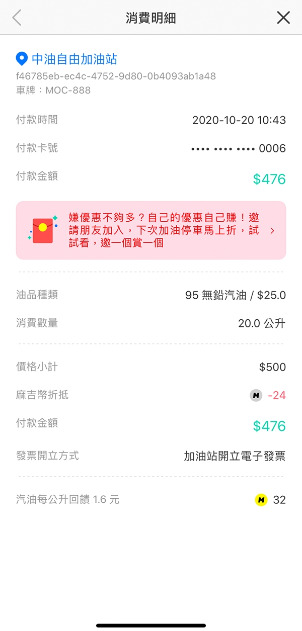 完成交易後,APP 會自動跳出消費明細頁,同時也會收到電子發票開立通知及交易明細 Email