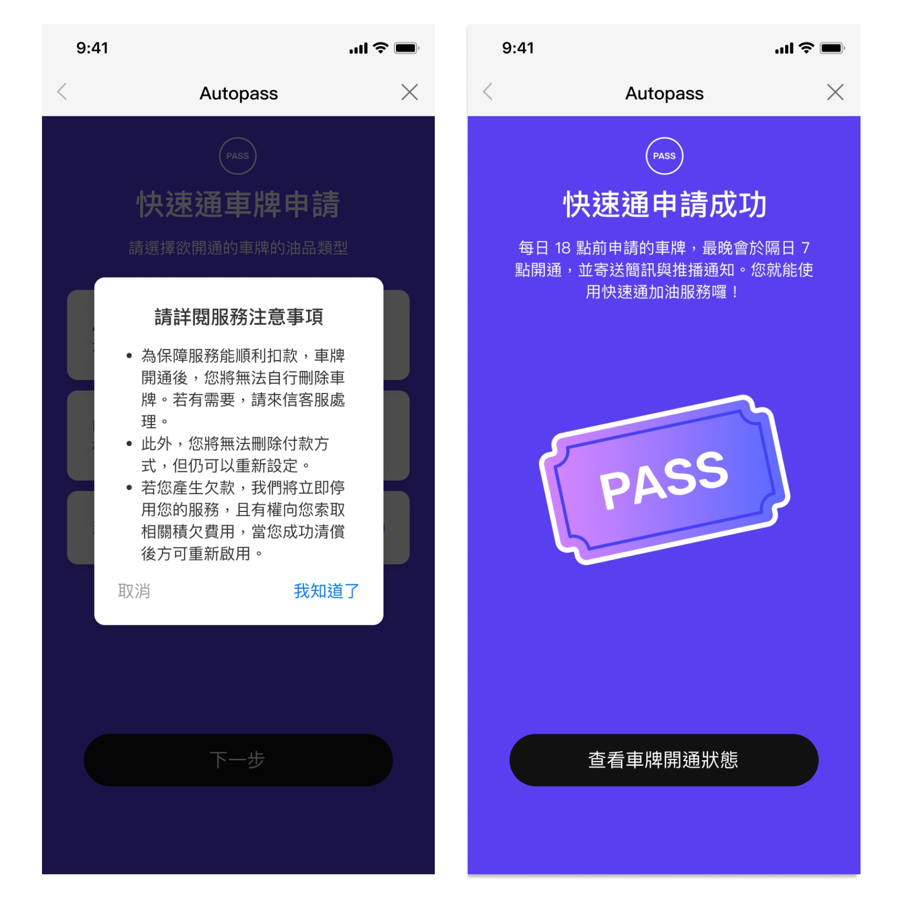 每日 18:00 前送出申請的車牌,系統最晚會於隔日 07:00 開通成功後,寄送簡訊與推播通知。
