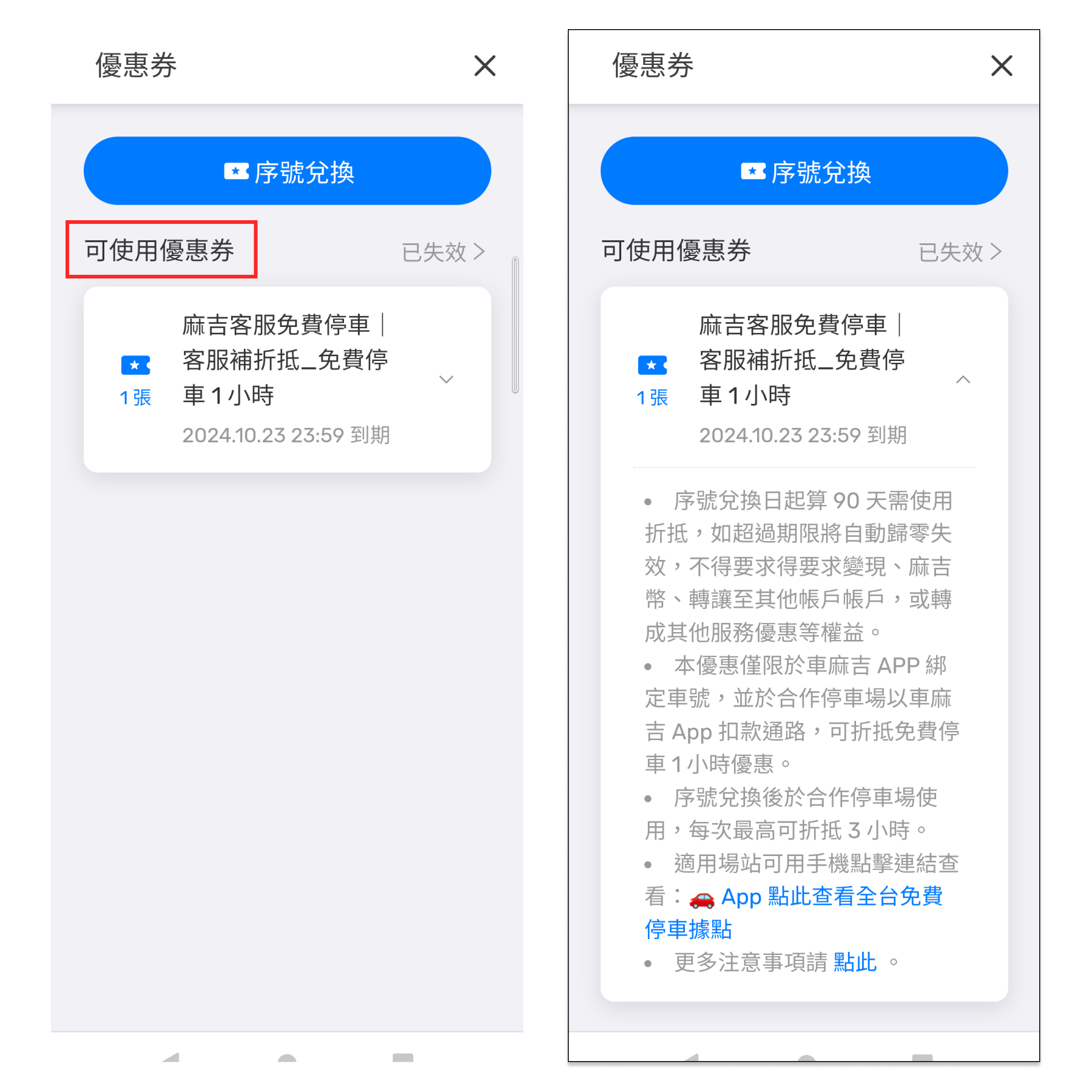 #### 每一組兌換成功的序號，在「可使用的優惠券」可以查看優惠類型、注意事項、有效期限等資訊。