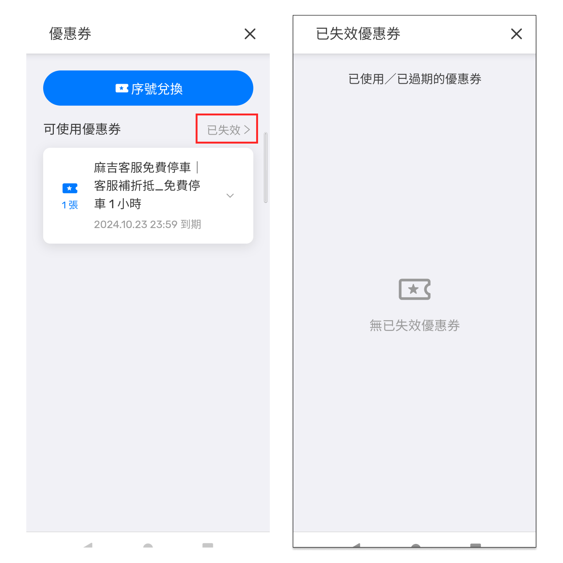#### 右上角的已失效，可以查看過往已用過/ 過期的優惠券。