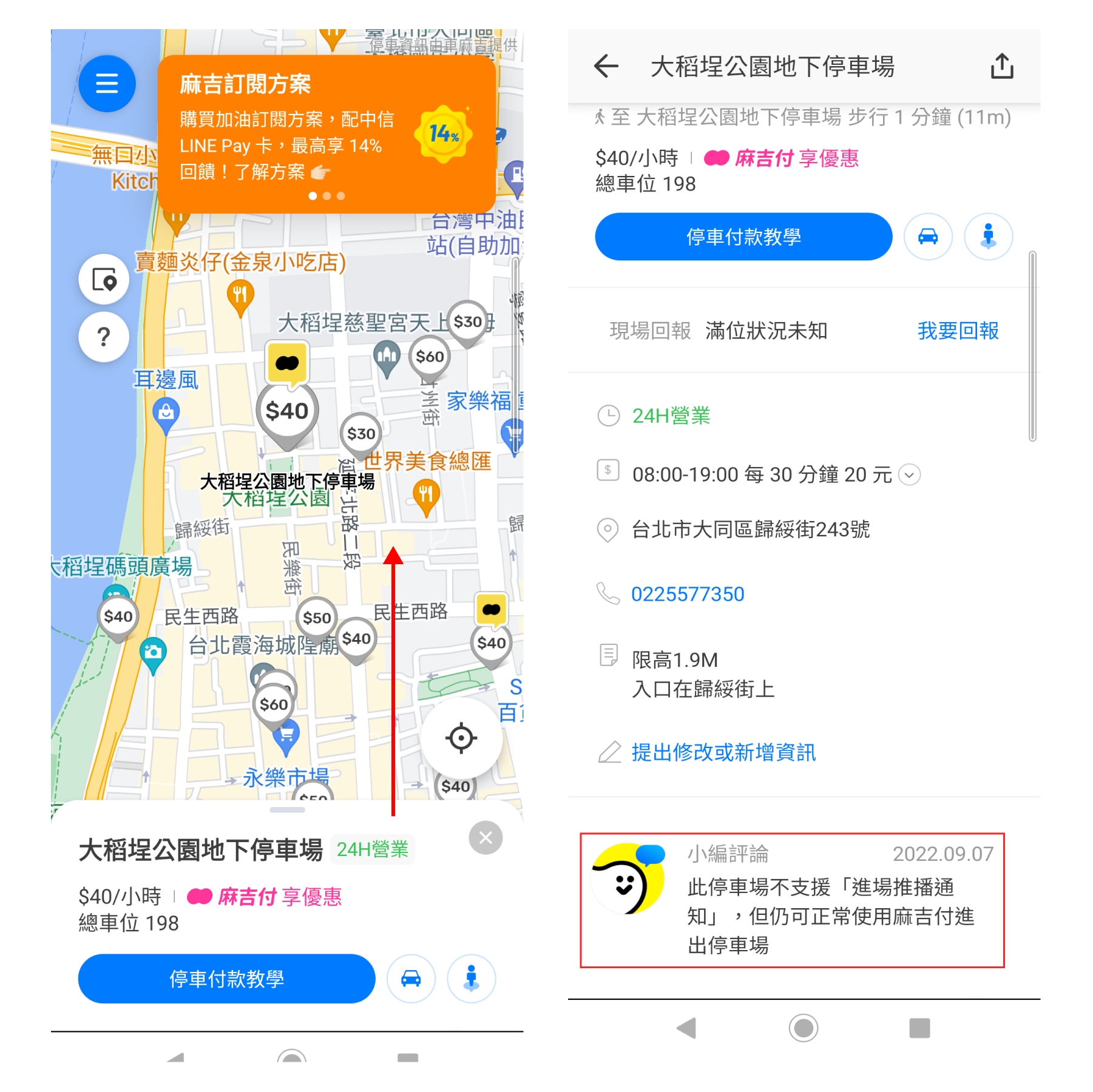 小地圖可查看停車中小卡,目前停車場尚未全面支援進場通知提示及停車中小卡,部分場站測試中。