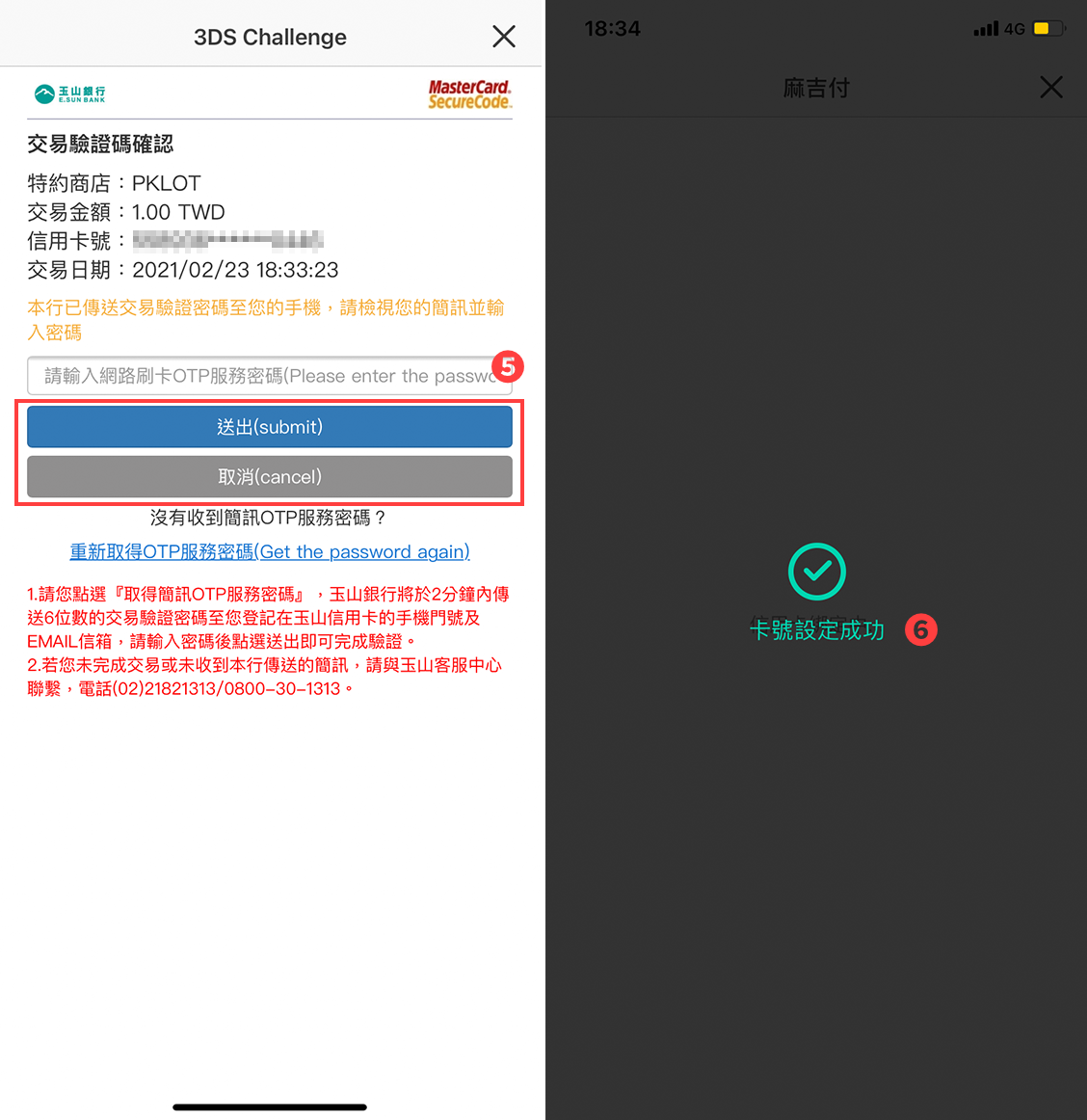 跳轉進入銀行刷卡驗證畫面,連線時請勿關閉視窗或執行其他動作。(新增卡片時車麻吉會刷 1 元以驗證卡片並立即刷退,請放心使用!)