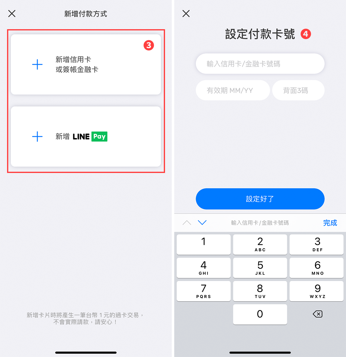 輸入信用卡或簽帳金融卡資料,輸入完畢後請按「設定好了」 (若您欲使用 LINE Pay,請依照 LINE Pay 設定流程進行設定)