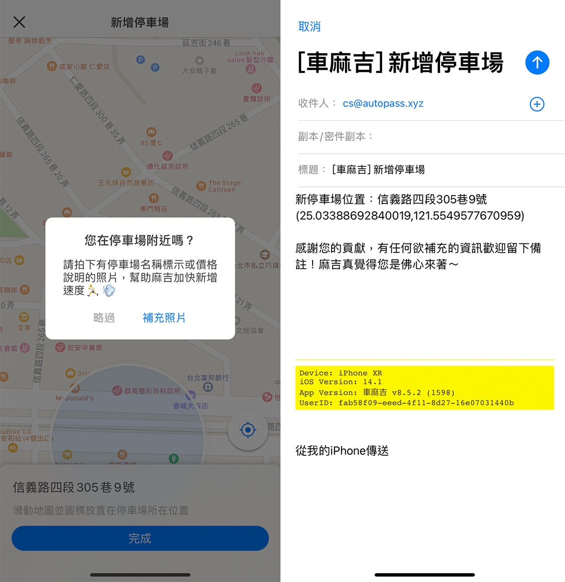 ❸ 利用完整照片或文字補充停車場資訊,傳送給車麻吉